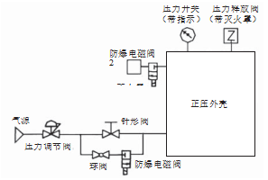 在正壓通氣型中,保護氣體持續(xù)流過正壓外殼并保持一定的流量,從而正壓外殼的壓力保持在工作壓力范圍內(nèi)。正壓補償型不需要持續(xù)通風。控制系統(tǒng)實時檢測正壓外殼的壓力,電磁閥控制保護氣體的流入和流出。當正壓外殼壓力過低時,打開進氣電磁閥補充空氣,使壓力上升到工作壓力范圍;當正壓外殼壓力過高時,打開排氣電磁閥進行排氣,使壓力降至工作壓力范圍。